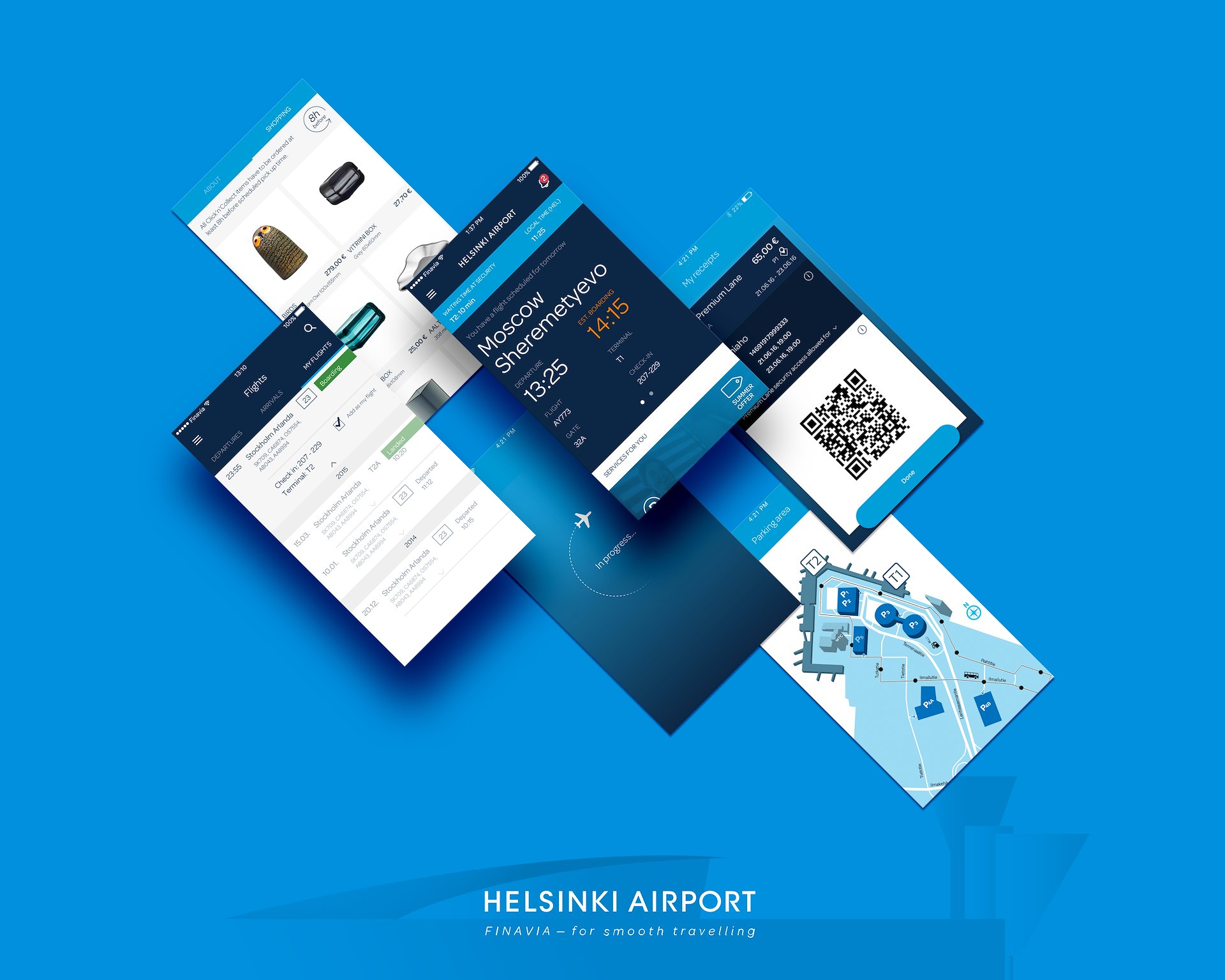 Push notifications about flight statuses • Helsinki Airport Security gates • Parking reservation system • GIS based digital map • Flight information • Bluetooth beacon based indoor positioning • Fully functioning web shop.